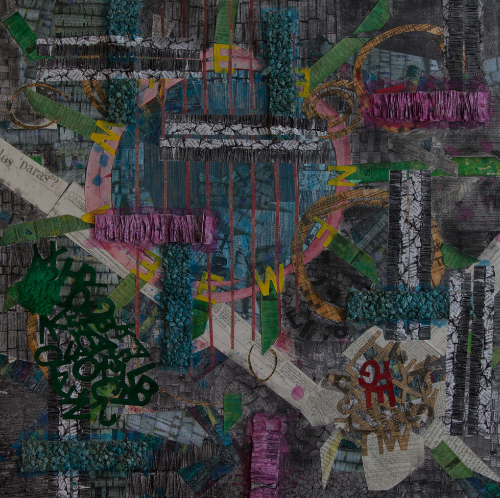 First a smaller piece is created using recycled materials from newspaper and magazine. Digital printing and repetition of the smaller piece creates an abstract grayscale and stone-like textured pattern in a grid layout.